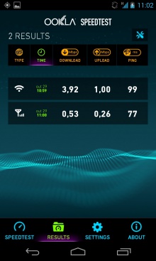 Todos os testes são gravados e você pode conferi-los depois na aba "Results" que fica na parte inferior do aplicativo. Ali você poderá ver qual foi a data e as velocidades obtidas. O primeiro ícone dos resultados indica se o teste foi feito utilizando uma conexão Wi-Fi ou por um rede de celular.